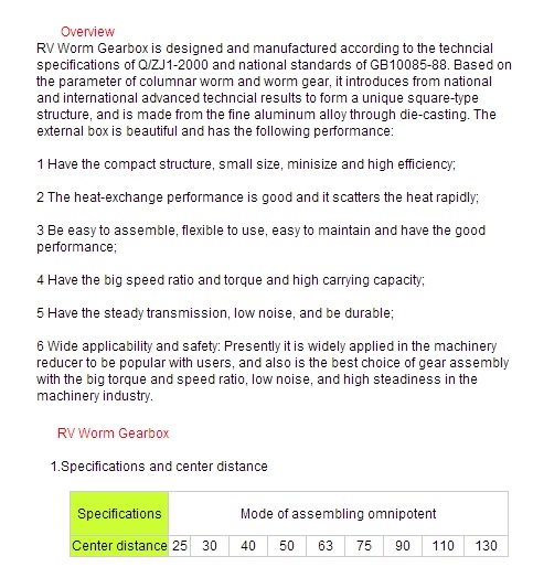 Worm gearmotor RV series is designed and manufactured according to the technical specifications of Q/ZJ1-2000 and national standards of GB10085-88. Based on the parameter of columnar worm and worm gear, it introduces from national and international advanced technical results to form a unique square-type structure, and is made from the fine aluminum alloy through die-casting. The external box is beautiful and has the following performance: